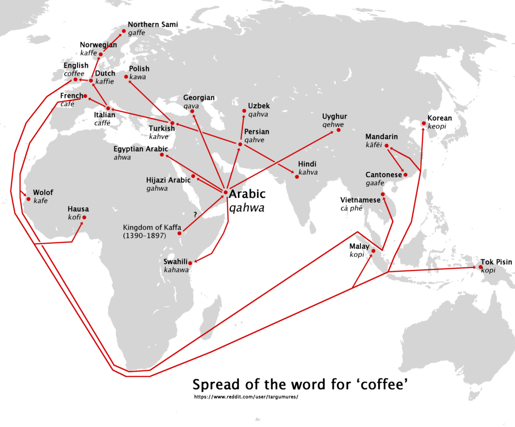 من إثيوبيا، انتشرت القهوة عبر البحر الأحمر إلى اليمن في القرن الخامس عشر، حيث بدأت أولى عمليات الزراعة المنظمة للقهوة [2]. أصبح ميناء المخا اليمني المركز التجاري الرئيسي للقهوة، ومنه انتشرت إلى مكة والمدينة مع الحجاج والتجار. سيطرت الإمبراطورية العثمانية على تجارة القهوة لفترة طويلة، حيث انتشرت من اليمن إلى دمشق وبغداد والقاهرة، ووصلت أخيرًا إلى إسطنبول في القرن السادس عشر. كانت القهوة في البداية تعتبر مشروبًا مقدسًا، تستخدم في الطقوس الصوفية لمساعدة الدراويش على البقاء مستيقظين أثناء الصلوات الليلية الطويلة.